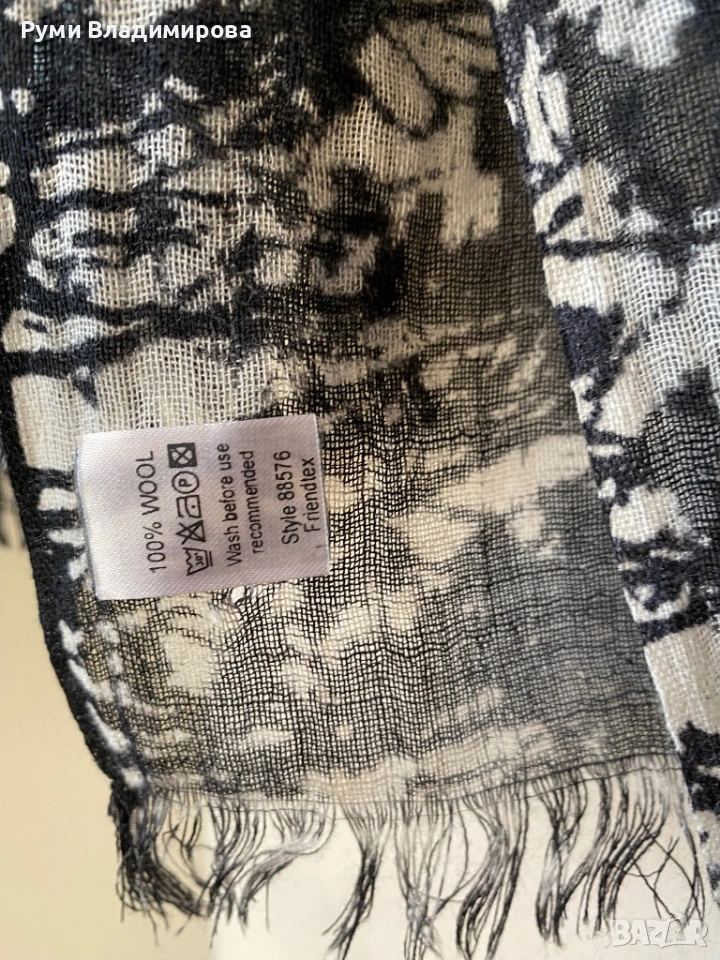 Бял шал с принт на черни борове от 100 % вълна → Обява 42957387