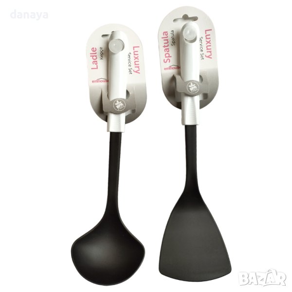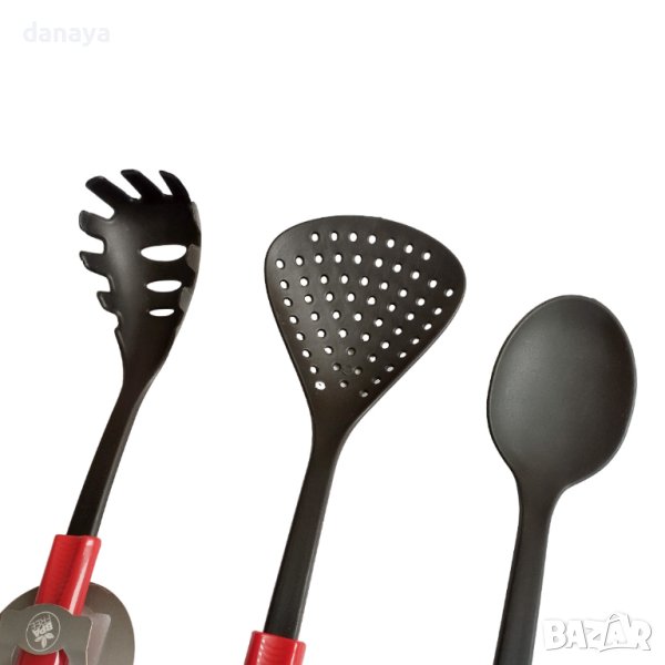 Комплект от 5 броя тефлонови прибори за готвене. Включва кухненска лопатка, кухненска лъжица, лъжица за спагети, черпак, решетъчна лъжица. Много удобни и практични. Всеки прибор си има дупка за закачане.