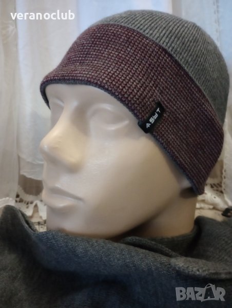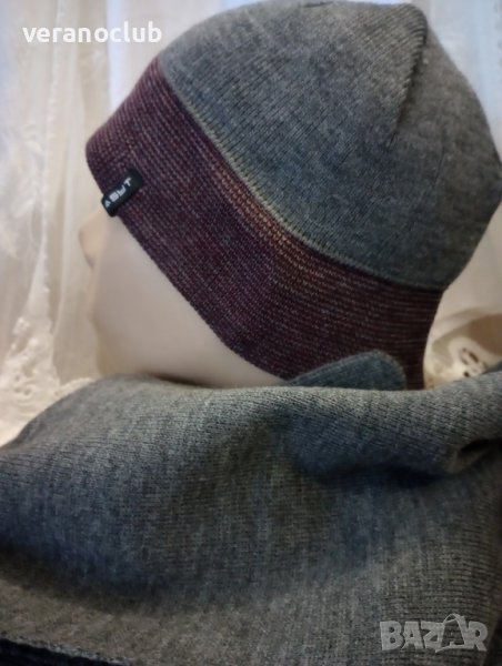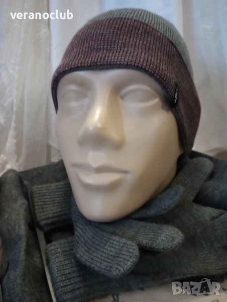 Мъжки плетен комплект Зимен. Комплектът включва шапка, шал и ръкавици. Цвят тъмносив, акцентиран с тъмночервени тънки линийки по края на шапката и в края на шала.