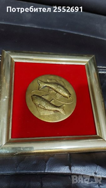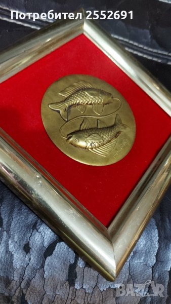 Метална декорация за стена с релефно изображение на риби .Наличие на надпис "PISCIS" . Размери- 16/16см.