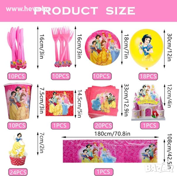 Компплектът включва 1 банер с принцесите, 1 топер за торта, 1 покривка, 10 чаши, 10 ножа, 10 вилици, 10 лъжици ,