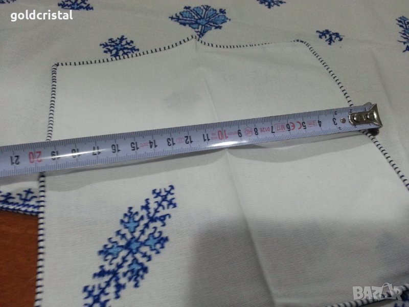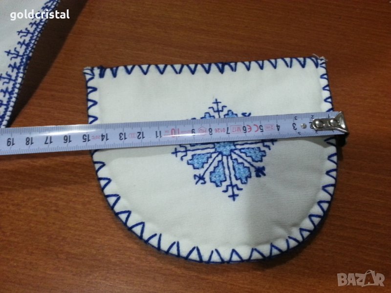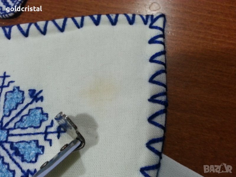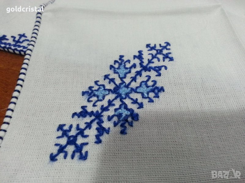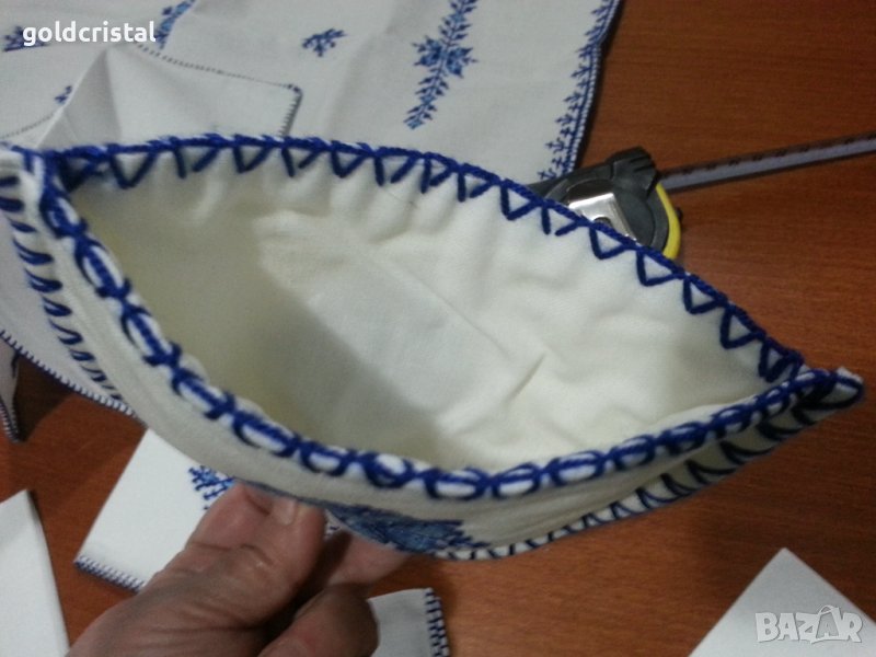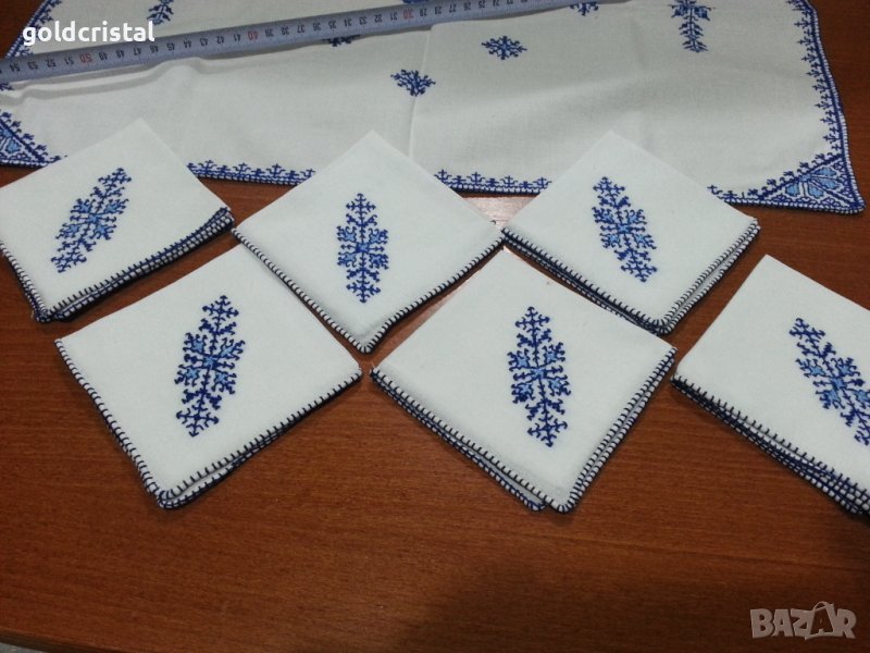 Комплект бродирано каре 6 бр текстилни кърпи и ръкохватка за горещи съдове ръчно бродирани материя памук само ръкохватката има бледо петънце сервиз комплект сет лот ретро арт декор винтидж колекция стари антикварни предмети обзавеждане за дома и семейството подходящи за подарък за ценители и колекционери