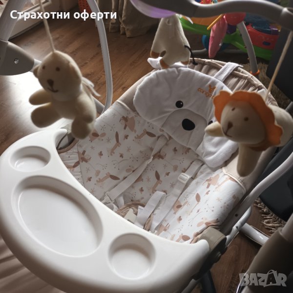 Изключително удобно за малко бебче, електрическа люлка 3 в 1, която аз ползвах до към 8-9 месец на моето бебче. Има колани и играчка въртележка над люлката, превръща се в шезлонг и има и табла и бебчето може да се захрани на нея и съвсем спокойно да се храни в люлката,защото е прекалено малко за столче. Изключително удобна има различни песни и дистанционно, което позволява контрол от разстояние.