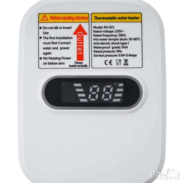 Характеристики: ◆ Автоматично изключване при изтичане. ◆ LCD цифров дисплей за температура. ◆ Мини корпус, пестене на енергия и висока ефективност. ◆ Безопасно и интелигентно, без воден поток спира отоплението. ◆ 3 секунди,за топла вода, термостат без чакане. ◆ Неръждаема конструкция, издръжлива, елегантна и модерна. ◆ Постоянната температура поддържа оптималната температура на водата за вас. ◆ Загрява вода, докато водата преминава през уреда, моментално нагряване, така че можете да използвате горещата вода, както искате. ◆ Лесен за инсталиране под банята или кухненската мивка за душ, миене на съдове, храна, дрехи и други функции. ◆ Безопасен нагревател, пестене на електроенергия, пестене на вода, без замърсяване, без изгорели газове. ◆ Различни защити: Защита от течове, IPX4 водоустойчивост, Защита от сухо нагряване, Водно-електрическа изолация, Автоматично изключване при неактивно състояние, Автоматично изключване при прегряване.