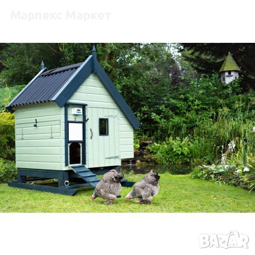 Вратата за кокошки е оборудвана и със заключващ механизъм, който не позволява на хищниците да я повдигнат с ноктите си.