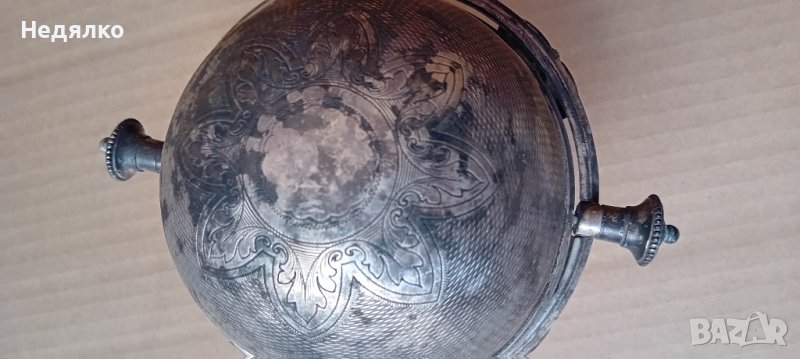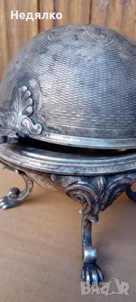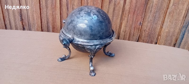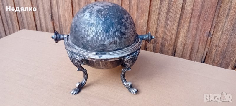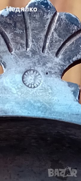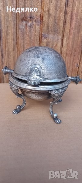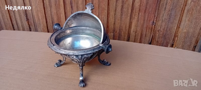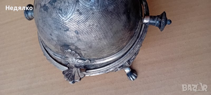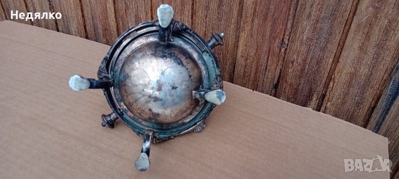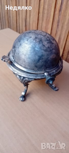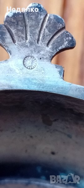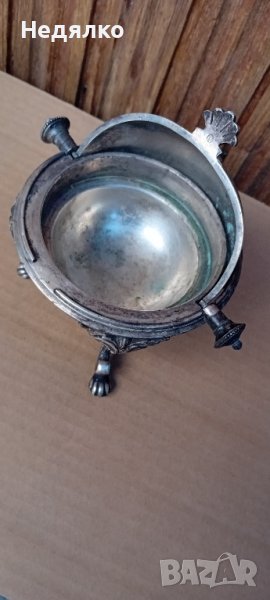 Красив,автентичен съд,бял метал,не е сребро,вероятно бял бронз,с естествена патина.Маркировка на капака,Art Krupp Berndorf и изправена мечка в средата.Направих спектрален анализ от любопитсво,интересна сплав от 62% магнезий и алуминий,23% сребро,другото е мед и никел и по малък процент други метали.