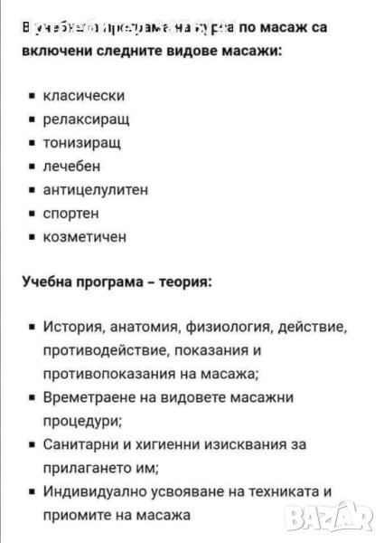 Професионални курсове за класически и лечебен масаж три модула - класически, лечебни и СПА терапии. Ние Ви подсигуряваме учебни помагала и материали, квалифицирани преподаватели със стаж и професионален опит, приятна атмосфера и индивидуален подход към всеки обучаван, международно признат сертификат, удостоверение с регистрация в НАПОО към МОН, Европас приложение, професионална подкрепа и добра бъдеща реализация. Може да се свържете с нас !