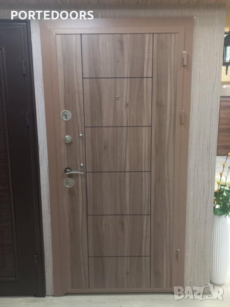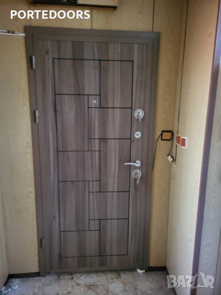 Входна блиндирана врата, изработена от 1.2 мм прахово боядисан метал и 10 мм MDF фрезован панел с ламинирано покритие.