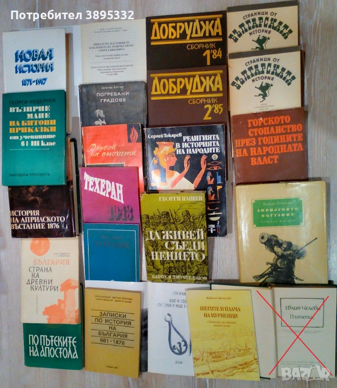 Книгите: Миналото, настоящето и бъдещето на човечеството според библията (Разтворената книга най-горе на втората колона); Двубоят; Новая история 1871-1917; Техеран 1948; Шегите и плача на мурненци; ; сборник от 2006 г. - Хайде на седянка със стари и млади (отворената книга на най-долния ред, под Шегите и плача на мурненци); Погребани градове – са по 1.50 лв., 0.77 €.