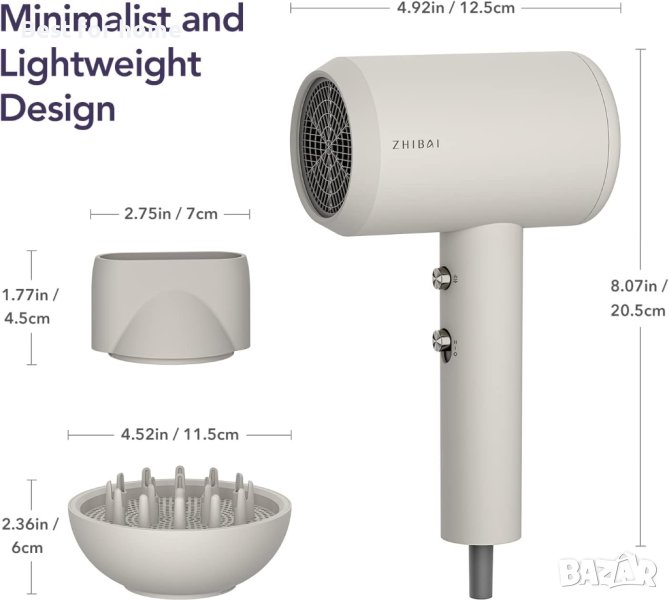 професионален сешоар ZHIBAI с йони,2 температурни режима, 1 дифузер и 1 накрайник за стилизиране,