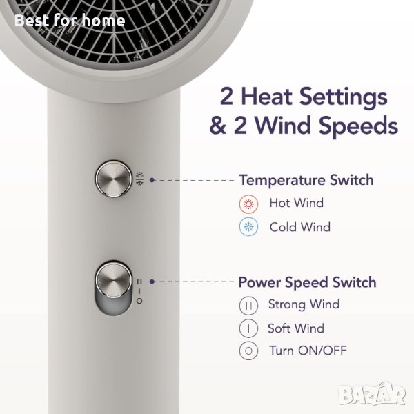 3 температурни настройки и 2 скорости: Когато изберете скорост на вятъра, натиснете бутона за горещ и студен въздух и температурата на въздуха се преобразува в топъл/студен. Изберете втората скорост на вятъра, натиснете бутона за горещ и студен въздух, температурата на въздуха се преобразува в силна топлина/силен студен въздух. Можете да избирате между различни скорости на вятъра и температури в зависимост от нуждите от грижа за косата. Това е идеален инструмент за коригиране на прически.