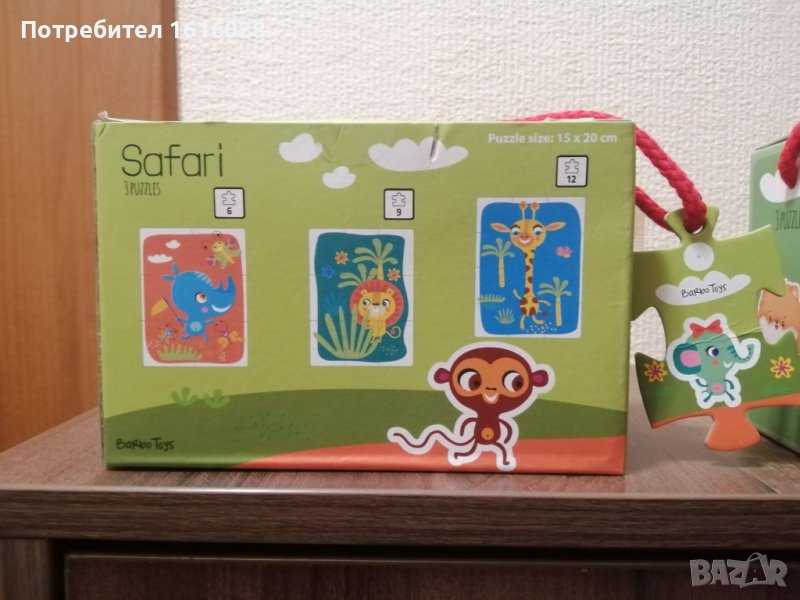 Детски пъзели с три картинки на животни.Комплекта съдържа 3 пъзела с различни картинки, размери и части.С големи твърди части от хубав качествен картон,с цветни картинки лесни за подреждане и от малки дечица.Трите пъзелчета са от 6,9,и 12 части,общо 27 части.Подходящи за деца 3+ годинки.