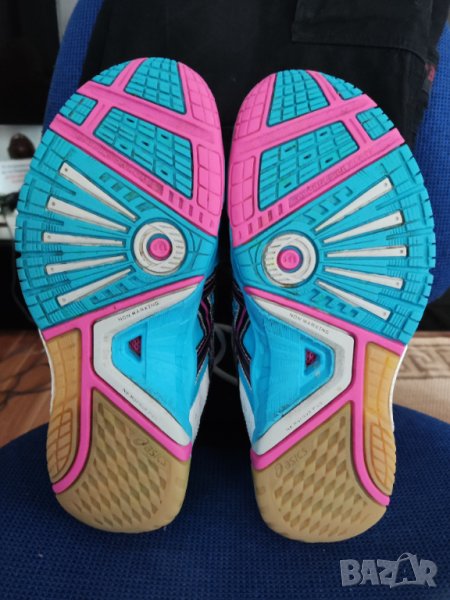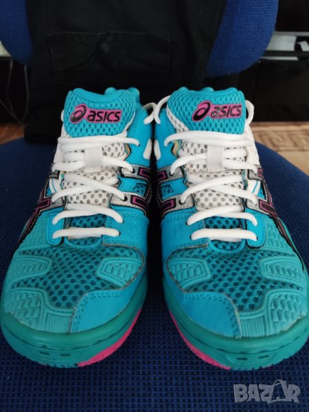 Оригинални маркови маратонки Асискс предназначени за вътрешни спортове в перфектно състояние.Тъй като тази разцветка е неутрална също може да се ползва и от момчета само да отговаря номерацията и естествено може да се ползват навсякъде независимо че са предназначени за вътрешни настилки.