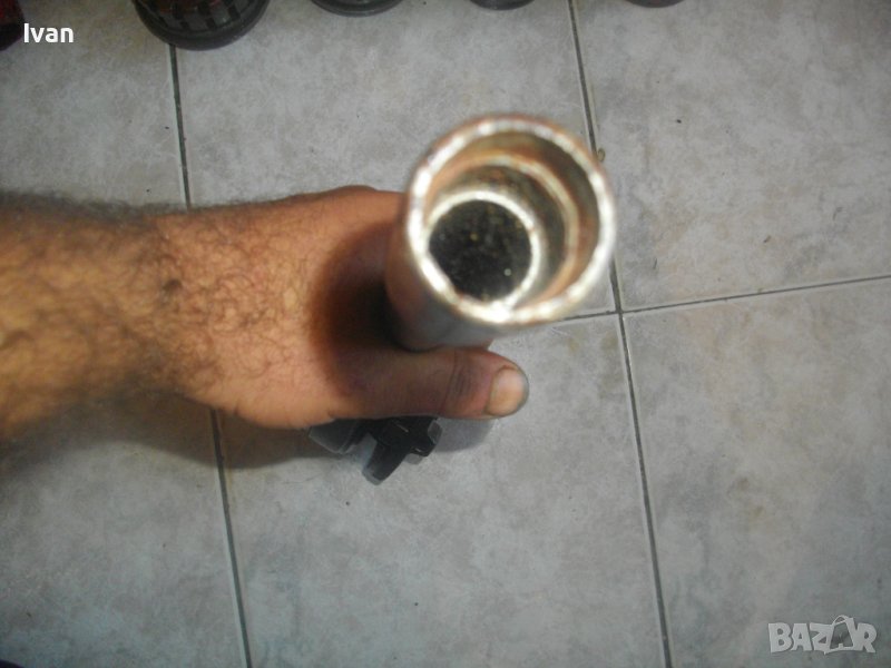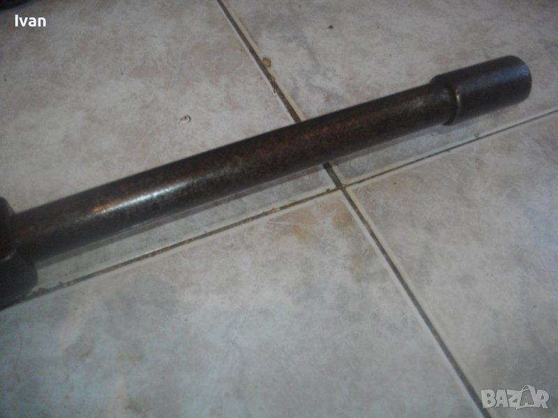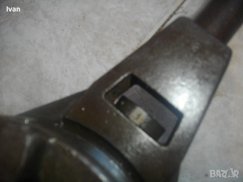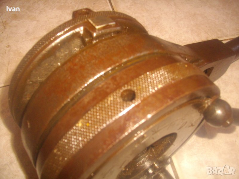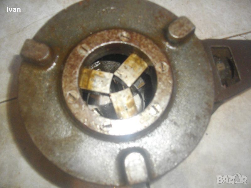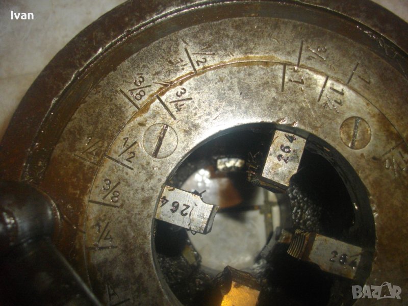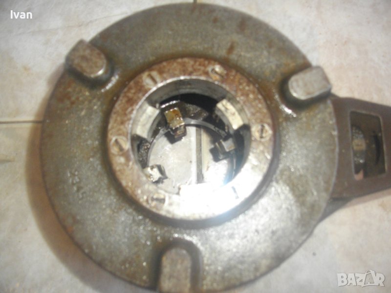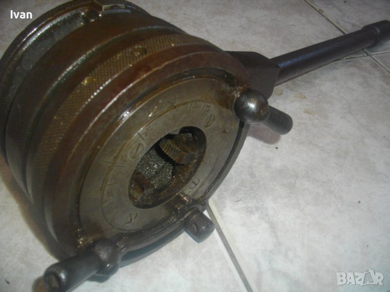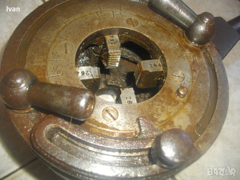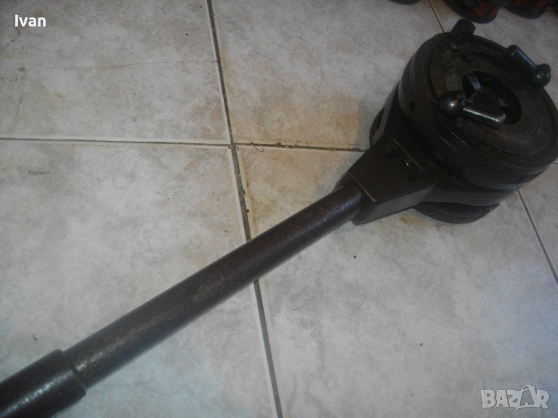 ОПИСАНИЕ на голяма масивна водопроводна, чешмеджийска плашка - винтонарезка - винторезка. Немска, старо качество. Профилактирана, смазана и гресирана. Запазен външен вид и ОТЛИЧНО техническо/работно състояние на инструмента. Всички механизми по отваряне и затваряне работят леко и без запъване. Размер на инструмента за направа на въшни резби на метални тръби от 3 / 4 цол до 1 1/2 цол. Поставени почти нови оригинални ножове 4 бр. на плашката размер 1 - 1 1/2 цол. Ножовете са в отлично състояние, без наранявания. Други ножове към плашката няма. Глава държач на плашката - ф 150 мм. Заани челъсти за притягане - отлично състояние. Дръжка на плашката - метална тръба на резба, снемаща се, с дължина 32 см и диаметър ф 25 мм. Цялостна дължина на плашката - 51 см. Височина на главата - 110 мм. Тегло на плашката - 7,5 кг.