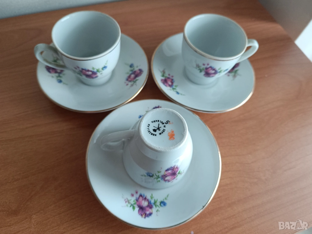 Китка, мини сервиз, без забележки освен фабрични несъвършенства, 3 бр чашки 90 мл с чинийки - златен кант