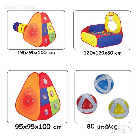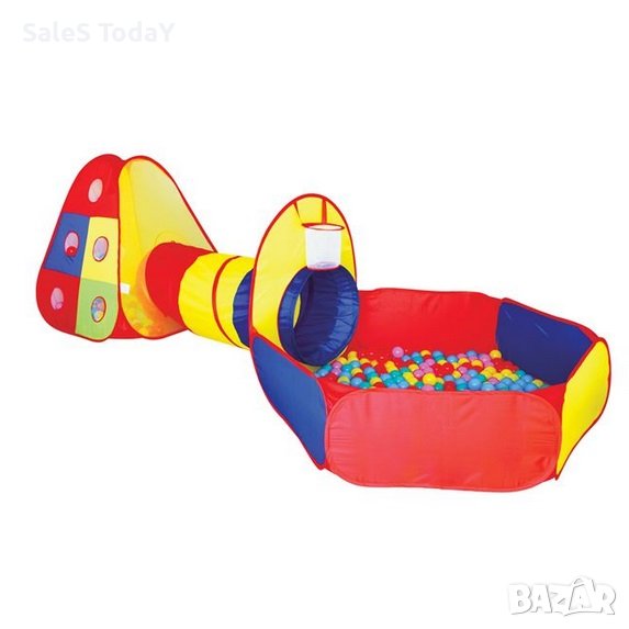 Детска палатка с тунел и малка площадка. Палатката има вход и също е свързана с тунела. Съдържа 80 цветни 6 см топки и 3 обикновени малки топки. Подходящ е за вътрешна и външна употреба и е много лесен за настройка.