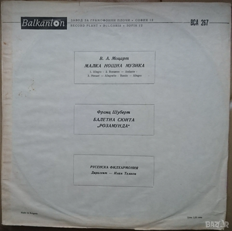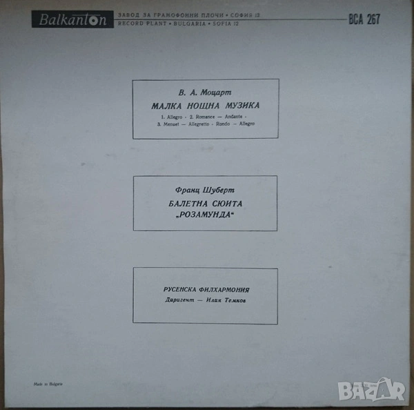 Грамофонна плоча В. А. Моцарт / Ф. Шуберт – Малка нощна музика / Балетна сюита "Розамунда", Балкантон ВСА 267 в отлично състояние.