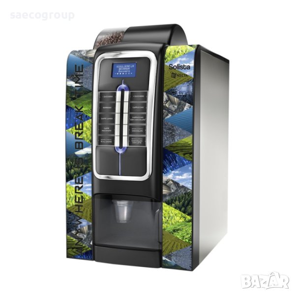 SOLISTA е последното допълнение на Necta за офис помещения. С елегантния си дизайн, големия капацитет и водещите технологии вендинг машината SOLISTA Ви предлага перфектно, прясно смляно кафе за броени секунди.