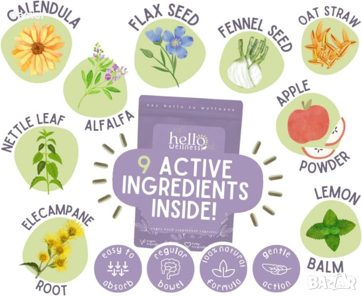 Капсулите „Hello Wellness Adapt to You за подпомагане на храносмилането“ са предназначени за ефективно подпомагане на храносмилането със 100% натурални съставки, включително семена от копър (100 mg) и корен от бяла ружа (100 mg), които облекчават лошо храносмилане, газове и запек. Тези високоякостни капсули също съдържат корени от лен и оман, подобряващи усвояването на хранителните вещества чрез покриване на лигавицата на храносмилателния тракт. Подходящи както за мъже, така и за жени, тези подходящи за вегани капсули не съдържат изкуствени оцветители и консерванти, осигурявайки безопасно, поддържащо здравето допълнение към ежедневието ви. Лесен за употреба, просто приемайте една капсула два пъти дневно с вода за оптимални ползи.