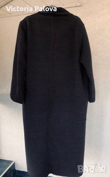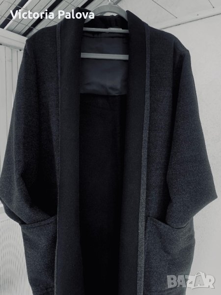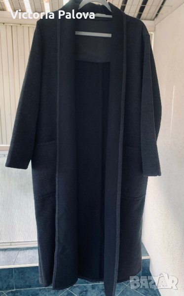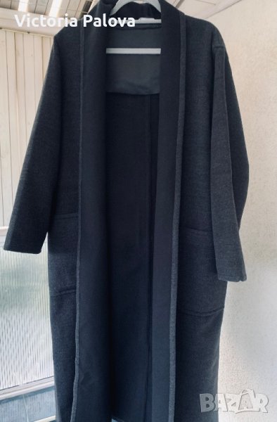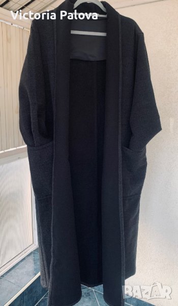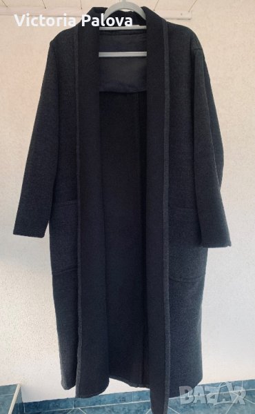 Много скъпо палто без закопчаване, при желание може да се носи с кожен колан; овърсайз, широко и просторно, кокон. Материята е вълна 100% - мека и е със специална обработка , като кашмир е, тъмносив цвят. Рамо - 50см, ГО - 66см, дължина - 125см, ръкав - 58см.