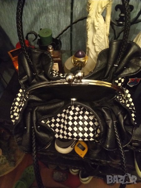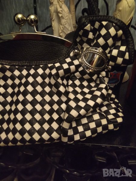 Изцяло естествена кожа черно и бяло ,плетка .със красиви сребристи декорации ,има едно основно отделение ,едно да документи и две по малки ,отвън също има действащи копчета и могат да се слагат дребни предмети .Чантата е норвежка .Може да се носи и през ръка и през рамо дръжките са дълги над 30 см .Чантата е с размер 30 на 20 см дъното е твърдо и е 11 см .В перфектно състояние .КРАЙНА ЦЕНА