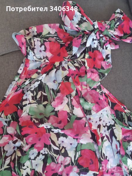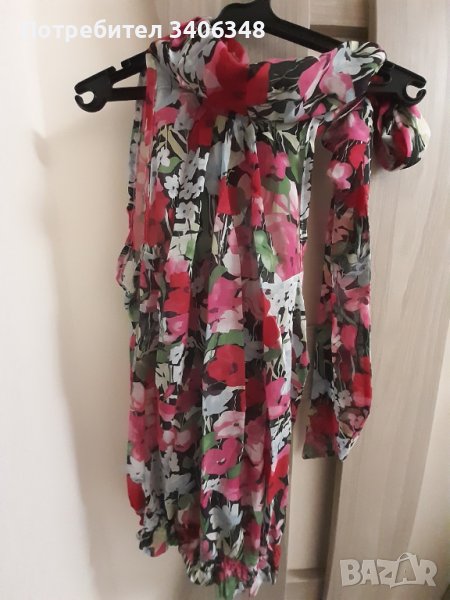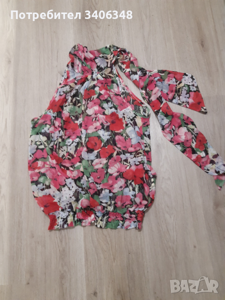Флорална блуза без ръкав, шифон, много свеж и красив цвят. В долния край е с ластик и може да се регулира дължината. На шията се вързва и може да се носи по различен начин. Гръдна 106, дължина 60 см. Цена 18 лева.