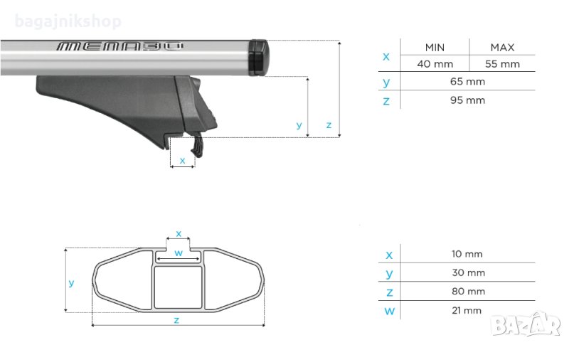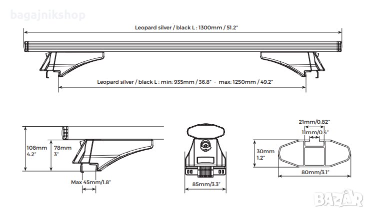 Багажникът MENABO LEOPARD L 130 е предназначен за монтаж на превозни средства, оборудвани с интегрирани релси на покрива.Комплектът на багажника включва 4 лапи и 2 алуминиеви профила.Багажникът е снабден с ключалки и два ключа, за защита на багажа от кражба.Дължината на напречните греди е 130 см.Има вграден Т-образен жлеб.Максималната товароподемност на този модел е 75 кг. Автомобили на които могат да се монтират гредите: AUDI A3 (8PA) Sportback 04>12 AUDI A3 (8VA) Sportback 13>16 AUDI A4 (B8/8K) Allroad 08>15 AUDI A4 (B8/8K) Avant 08>15 AUDI A4 (B9/8W) Avant 15> AUDI A6 (4F) Avant 04>11 AUDI A6 (4G) Allroad 12>14 AUDI A6 (4G) Allroad 14> AUDI A6 (4G) Avant 11>15 AUDI A6 (4G) Avant 15> AUDI Q3 (8U) 11> AUDI Q5 (8R) 08>14 AUDI Q5 (8R) 14>16 AUDI Q7 (4L) 05>15 BMW Serie 2 (F46) Gran Tourer 15>BMW Serie 5 (F11) Touring 10>13BMW Serie 5 (F11) Touring 13>16BMW X1 (E84) 09>12BMW X1 (E84) 12>15BMW X1 (F48) 15>BMW X4 (F26) 14>18BMW X5 (E70) 10>13BMW X5 (F15) 13>18BMW X5 (G05) 19>CITROEN C4 Aircross 12>DACIA Lodgy 12>FORD Focus III Station Wagon 11>14 FORD Focus III Station Wagon 14>FORD Galaxy III 15>HONDA Civic IX Tourer 13>15HYUNDAI ix35 (Integrated rail) 10>13HYUNDAI ix35 (Integrated rail) 13>HYUNDAI Maxcruz (DM) 12>HYUNDAI Santa Fe (DM) 12>HYUNDAI Tucson (TL) 15>JAGUAR F-Pace 16>JAGUAR XF Sportbrake 12>KIA Carens (RP) 13>KIA Grand Carnival (YP) 14>KIA Sorento (UM) 14>KIA Sportage (SL) 10>13KIA Sportage (SL) 14>16LAND ROVER Discovery Sport (L550) 15>LAND ROVER Range Rover 2 Sport (L494) 14>LAND ROVER Range Rover Evoque(L538) 11>LAND ROVER Range Rover Velar (L560) 17>LEXUS NX Hybrid 14>MAHINDRA Quanto 12>MERCEDES GLC (X253) 15>MITSUBISHI ASX 10>13MITSUBISHI Outlander 12>MITSUBISHI Outlander PHEV 14>NISSAN Qashqai / Dualis (J11), 14>17NISSAN Qashqai / Dualis (J11), 17>OPEL Insigna Sportourer 09>13OPEL Insigna Sportourer 13>17OPEL Zafira (B) 08>12 OPEL Zafira (C) Tourer 11> PEUGEOT 4008 10>13PEUGEOT 308 Station Wagon 14>PEUGEOT 508 Station Wagon (no tetto vetro / no sunroof) 11> 14RENAULT Kadjar 15>VOLKSWAGEN Passat (B8) Variant 14>VOLKSWAGEN Tiguan (5N) Cross 14>VOLVO V60 Cross Country 15>VOLVO V90 16>VOLVO XC60 08>13 VOLVO XC60 14>17VOLVO XC90 (Integrated rail) 14>VOLVO XC90 (Raised rail) 14>