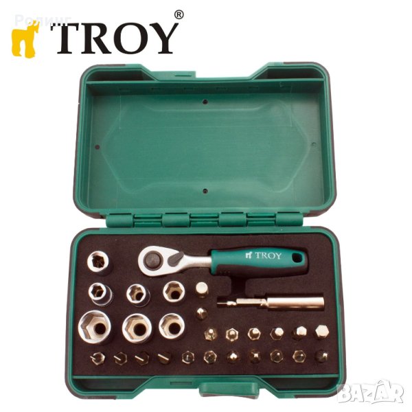 Комплект гедоре мини тресчотка с вложки и битове 1/4“ 28 части / Troy 21948 /