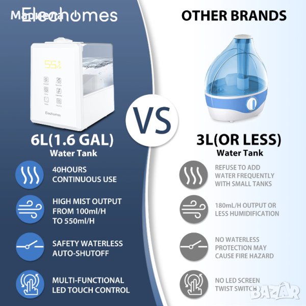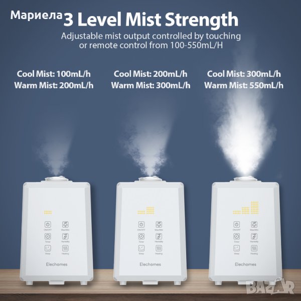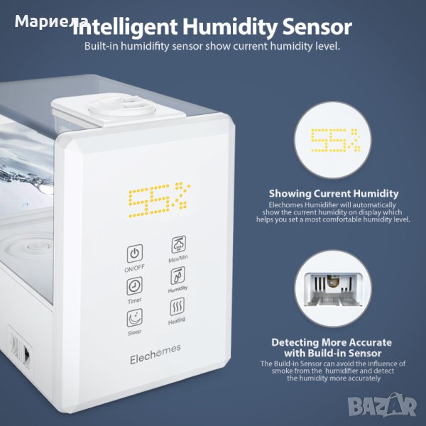 Ултразвуков овлажнител Elechomes 6L, топла и студена мъгла за голяма стая