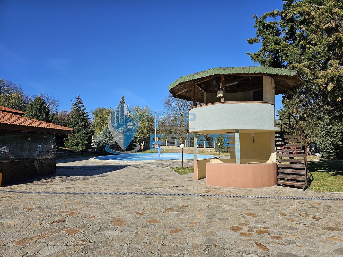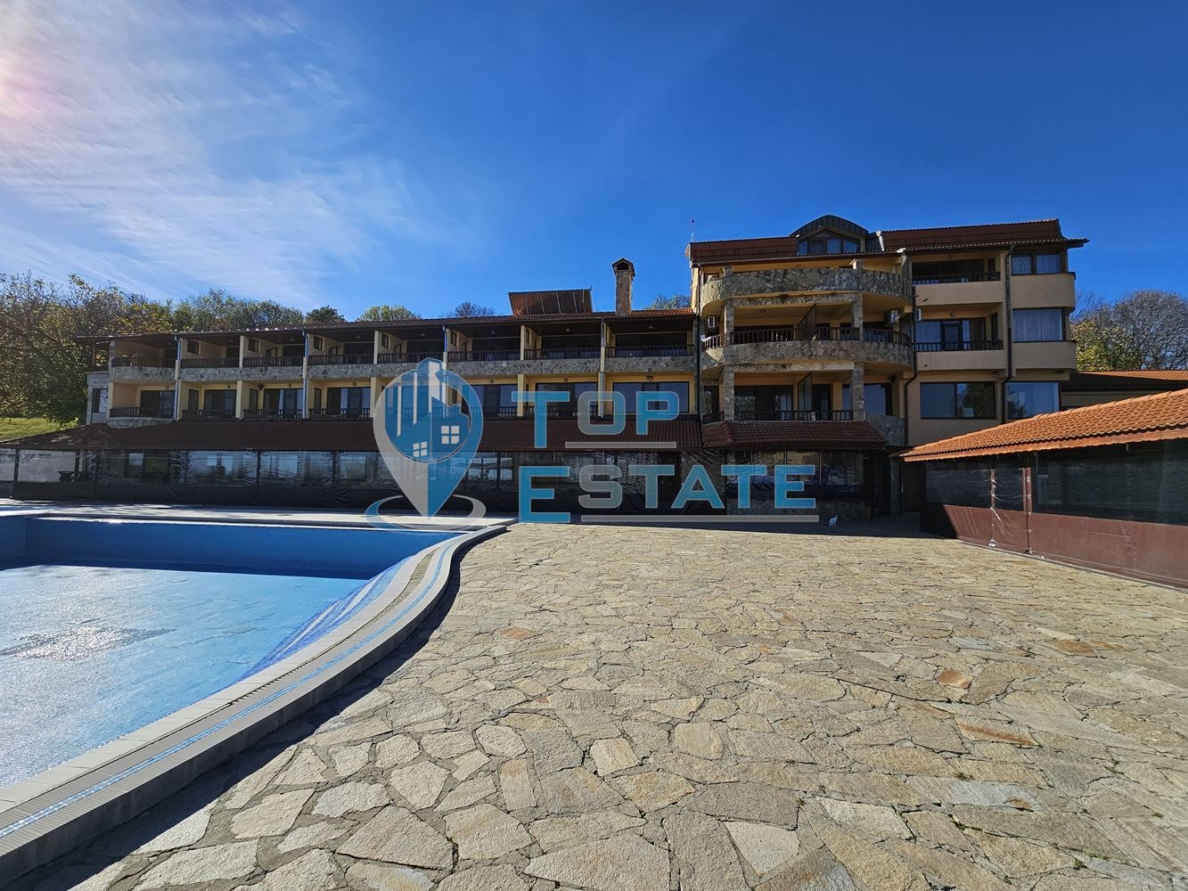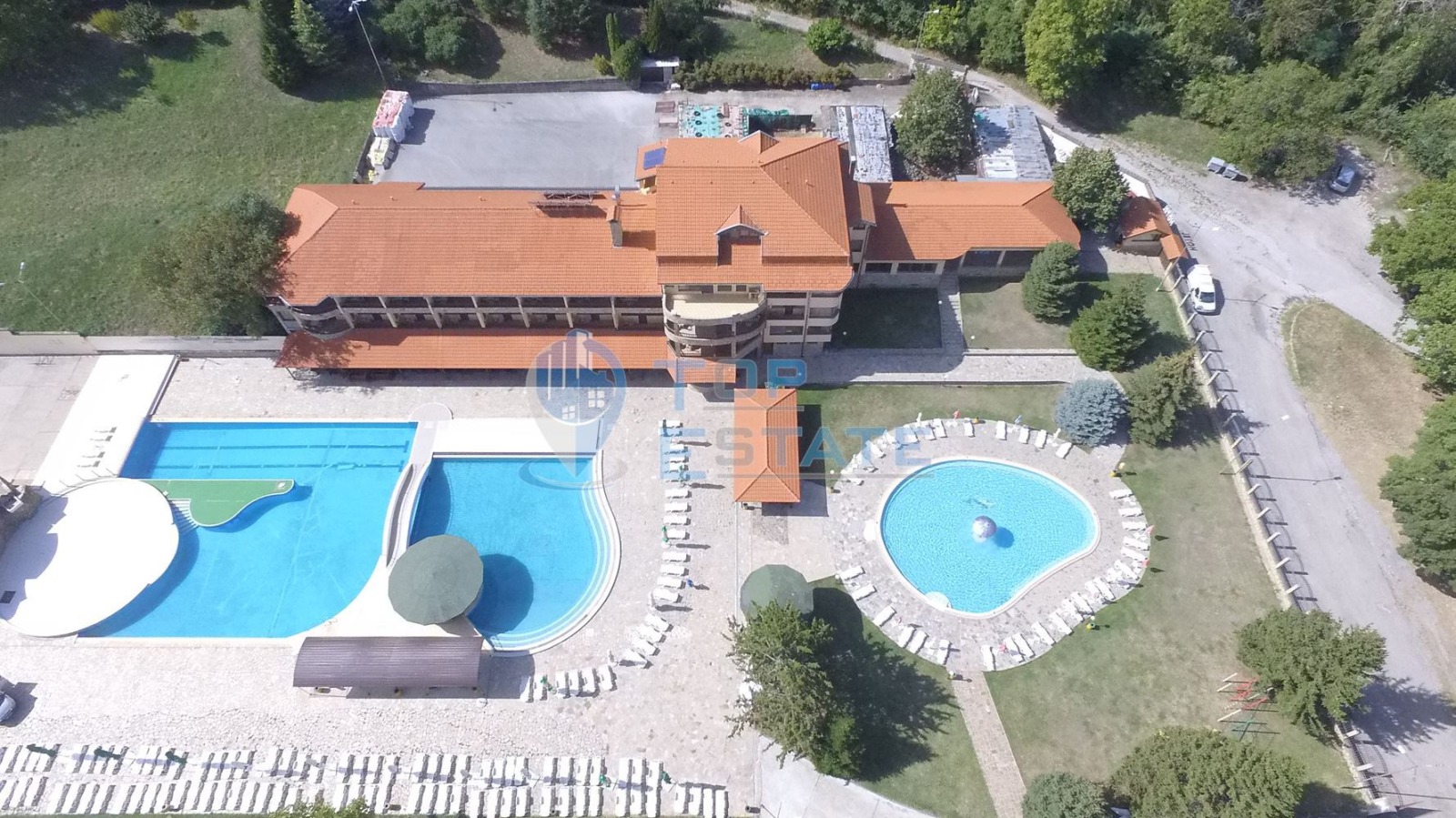 Топ Естейт Недвижими имоти ви предлага хотел с три басейна и прекрасна панорама над гр. Лясковец, област Велико Търново. Имотът се намира в на няколко километра от областния град Велико Търново, както и от архитектурния резерват Арбанаси, а също така главния път София-Варна преминава покрай града. Сградата е със разгъната застроена площ от 2441 кв., като хотелската част се състои от 20 стаи с площ между 40 и 50 кв.м, както и два апартамента. Първият етаж се състои от фоайе, рецепция, офис, конферентна зала с 40 места, десет стаи и един апартамент. Вторият етаж се състои от десет стаи, част от които са с три легла и са на две нива, както и един апартамент. На същият етаж е разположен и апартамент с площ от 450 кв.м, който се състои от четири спални, просторен хол (80 кв.м) и пет санитарни помещения. Хотелската част е оборудвана с всичко необходимо за приятен престой на гостите - легла, дивани, гардероби, телевизори, климатици и др. Изложението на имота е панорамно с изглед към града и басейна, като всяка стая разполага със собствена тераса. На приземното ниво ориентирано към басейна е разположен ресторант с обща площ от 360 кв.м, заедно с прилежащите му кухня, обслужващи помещения и две тоалетни, като капацитетът на ресторанта е 120 места, а през лятото отвън са налични още 60 места. Кухнята е напълно оборудвана с фурни за пица, фритюрници, скара, електрически и газови котлони, машини за лед, хладилници, фризери. Отоплението е решено чрез три газови котела с мощност 200 kW, два бойлера (1000 л. и 500 л.), както и климатична сплит система за отопление и охлаждане с 16 вътрешни тела, като сградата е свързна с газопреносната мрежа на града. Имотът разполага с асфалтиран паркинг с площ от 600 кв.м за 30 автомобила със седем покрити паркоместа, както и детска и спортна площадки. Басейните са три, с обща площ от 1000 кв.м.( 1 детски и 2 големи с обща кубатура 1000 куб.м.), както и съблекални с душове и тоалетни за мъже и жени (60 кв.м.). Парцелът е с площ от 16 000 кв.м, като 2000 кв.м са зелена площ, изградена e фотоволтаична централа за собствени нужди с мощност от 50 кW, а също така има и одобрен проект за изграждане на изба и спа център на площ 1000 кв.м. в границите на имота. Достъпа е целогодишен по асфалтов път, а пред имота е обособен паркинг за гости. Поради страхотното си местоположение, разработения бизнес и прекрасното качество на строителство, предложеният имот е изгодна инвестиция. Номер на оферта 1860. We speak English.