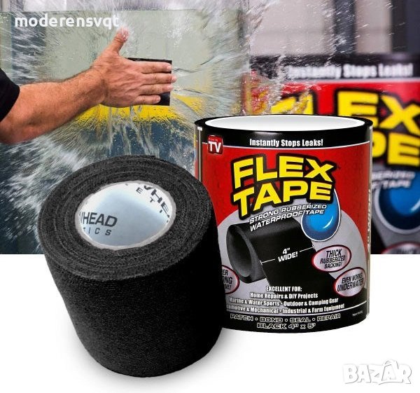 Flex Tape е супер силна, гумирана, водоустойчива лента, която може да залепва, свързва, запечатва и ремонтира почти всичко. Спира незабавно течове. Flex Tape е специално формулирана с дебела, гъвкава гумирана подложка, която съответства на всяка форма или обект. Тя захваща повърхността супер стегнато и я облицова като създава моментално супер силно водоустойчиво уплътнение. Толкова е силна, че дори работи под вода. Твърдото дебело лепило изглежда все едно се заварява върху повечето повърхности.