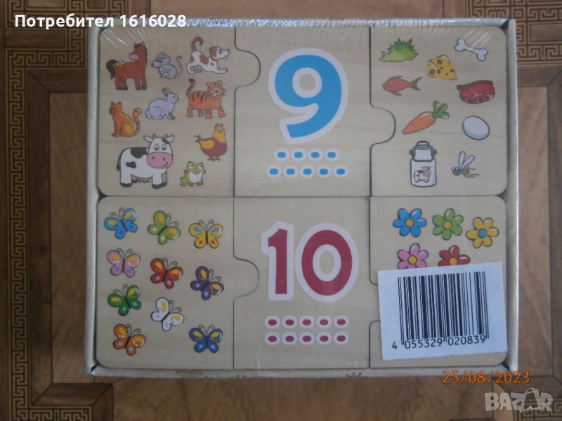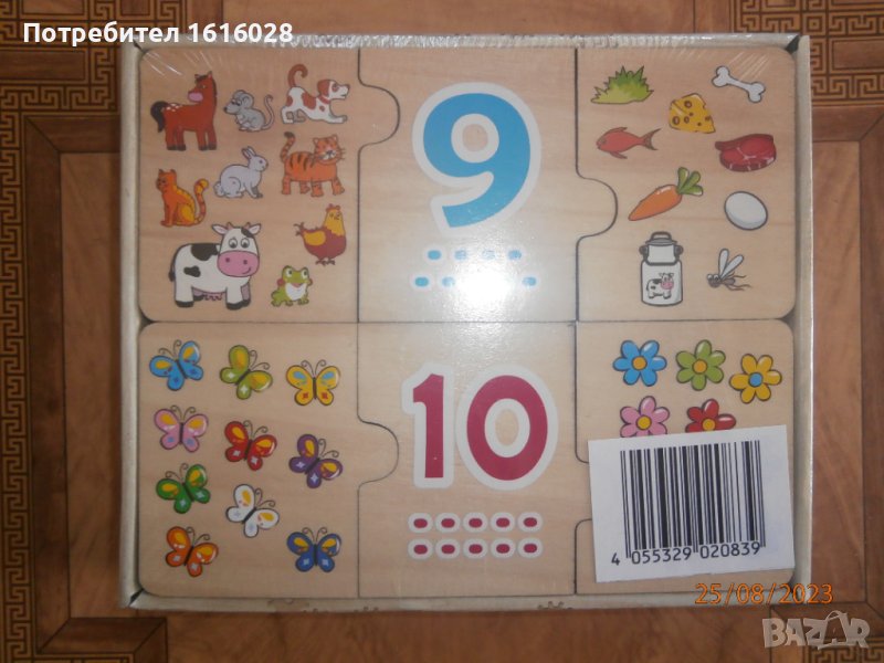 Нов детски дървен пъзел с цифри и картинки от естественна дървесина.