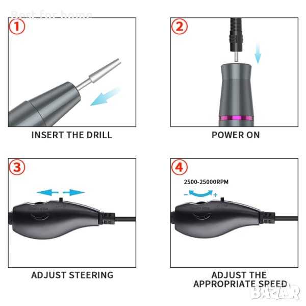 Регулируема скорост и посока: Машината за пробиване на нокти се върти до 25000 оборота в минута, скоростта е регулируема, можете да регулирате скоростта според собствените си нужди. Двете посоки на въртене са регулируеми, можете да го настроите според собствените си навици и може да се използва с две ръце.