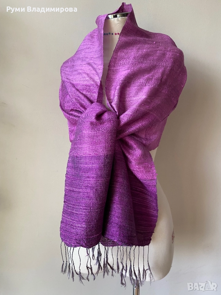Лилав шал от 100 % коприна според мен три преливащи лилави цвята, с ресни, с размер 168 Х 42 см, мека, топла материя, нов, доставка с Еконт.
