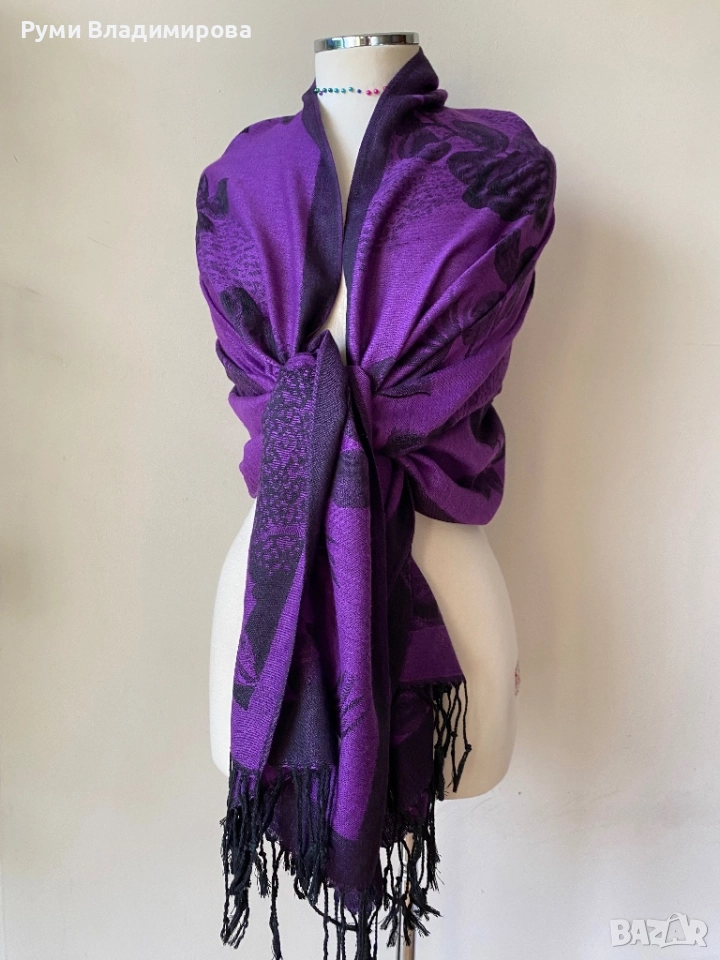 Тъмно лилав шал на черни рози с две лица от 70 % пашмина и 30 % коприна, плътна материя, с черни ресни, нов, ефектен, зимен. Доставка с Еконт.