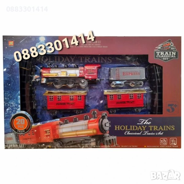 Детска играчка класическо влакче с релси и три товарни вагона, изработена от качествена и здрава пластмаса със звукови и светлинни ефекти.