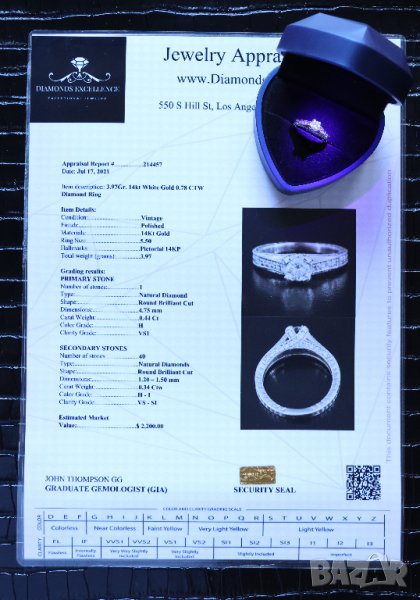 - Два броя сертификати - оценителен доклад на бижуто направен в Лос Анджелис на стойност 2200$ и цялостен лабораторен анализ за естествения произход на диамантите направен в България.