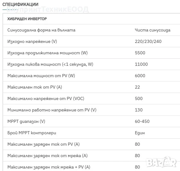 Соларният контролер с MPPT технология гарантира максимален добив и ефективно оползотворяване на фотоволтаичната енергия. Инверторът поддържа входящ ток до 22А и напрежение до 500 V DC, което позволява свързване на повече панели в серия и минимизира загубите при преноса на енергия. Максималната мощност на свързаните панели е 6000W. Дисплеят на инвертора показва количеството усвоена соларна енергия в kW/h.