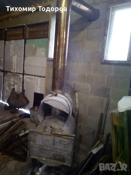Продавам печка за отопление за помещения за работа-сервизи,работилници складове.Гори ненарязани дърва по около 80см до метър,въглища,дървени материали,дървени отпадъци,пдч(изрезки от мебели),паркет.Продава се в комплект с стойката на която стои на снимката,вътре в печката има пепелник за събиране на пепелта,метална скара която се изважда лесно,върху печката има дифузиор с голям вентилатор,зад печката има лира с малък вентилатор който подава топъл въздух през лирата към големия вентилатор и от там към дифузиора за издухване на топлия въздух,има клапа за регулиране на горенето и клапи за подаване на въздуха.Буриите за дима са скъпи,от неръждаема стомана изработени са по поръчка с диаметър 200мм и обща дължина около 5-6 метра,коминът накрая завършва с островърха шапка.Отоплявала е спокойно помещение с размери 120кв.м и средна обща височина 4 метра и половина ,помещението е било с лоша топлоизолация,зидано от итонг с покрив от чиста ламарина без изолация,среден разход 3-4 чувала дървени отпадаци и материали за ден.Печката е самоделна,лично аз съм я направил и е с много високо КПД за което гарантирам,топли жестоко и е много по добър и изгоден вариант за отопление от газовите калорифери.