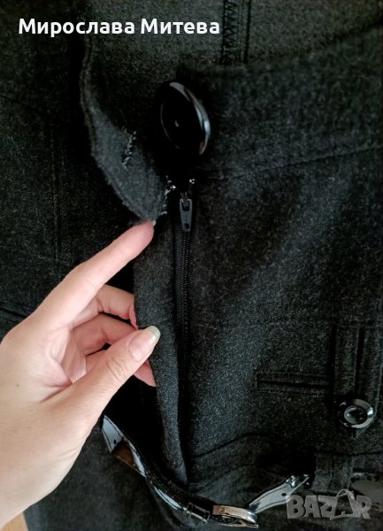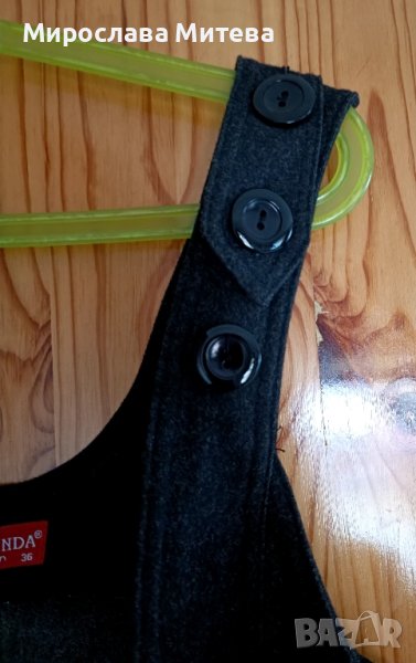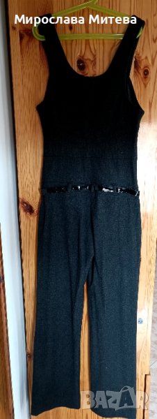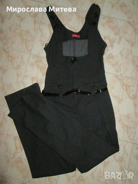 Дамски гащеризон с разкроени крачоли, 36 размер. Плътна материя подходящ за есенно-зимния сезон. Дължина на крачолите от чатала 75см, талия 34см едностранно. Графитено сив цвят.