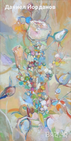 Голяма картина оригинал с маслени бои върху платно на бургаския художник Даниел Йорданов Алберчи. Картината е с размери 50 х 100 см. Рисувана е 2025 год. в характерния за художника експресионистичен стил. Натюрморт с рози.