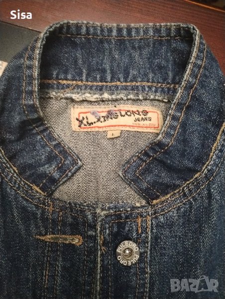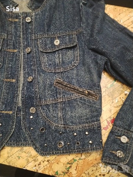 Дънково яке размер М-Л, ширина подмишници 47см, дължина от рамото 48см, ръкав от рамо 61см. Има на джобчето кожа която леко се лющи.