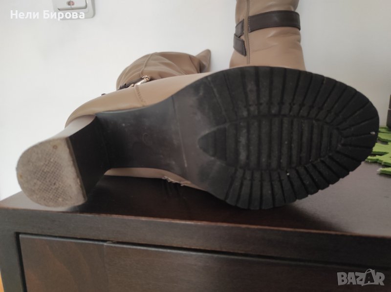 са изключително удобни, заради платформата в предната им част. Номер 36, материал – висококачествена кожа. Височина на платформата в предната част: 8 мм. Височина на целия ток: 8 см. Ботушите са подходящи за зимния сезон, тъй като имат мека топлеща подплата. Неразличими от нови, с оригиналните капачета на тока. Обувани са само един път по повод.