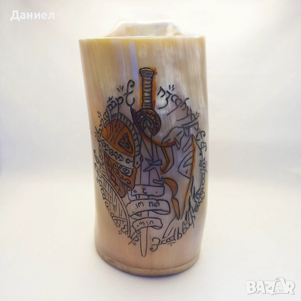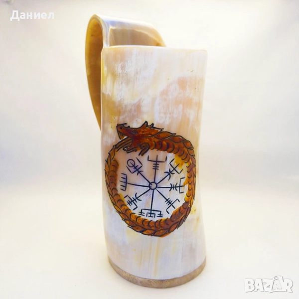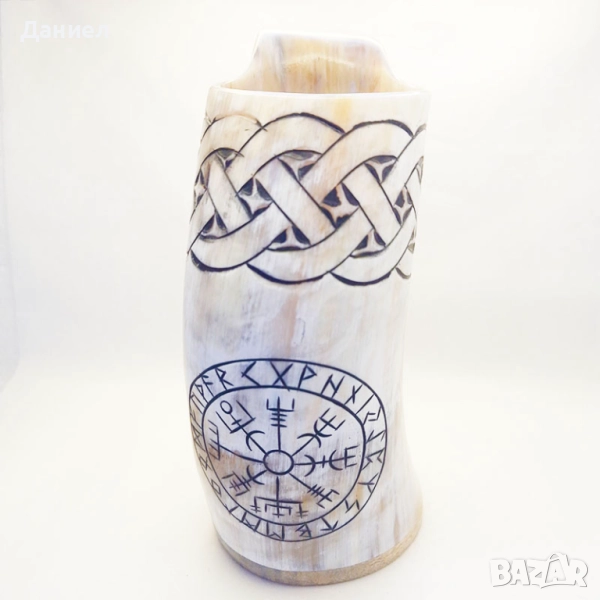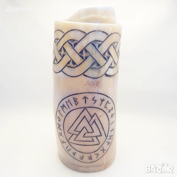 Чашата е гравирана с традиционни викингски мотиви, които носят духа на северната култура и я правят идеална както за ежедневна употреба, така и за специални поводи. За максимална безопасност и удобство е обработена със специална епоксидна смола, което гарантира дълготрайност и практичност.