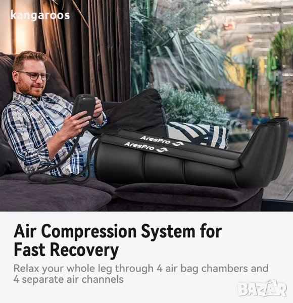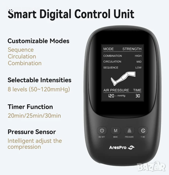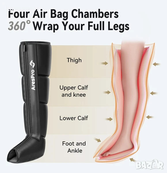 SMART SEQUENTIAL MASSAGE BOOTS - AresPro устройство за последователна компресия, надградено с вграден сензор за налягане, който може да регулира различна стойност на налягането според различните размери на краката. И 4 въздушни камери, надути и изпуснати последователно чрез пълно покритие на краката с последователност, за да ви донесе по-комфортно изживяване с компресионен масаж.