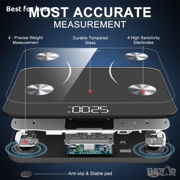 INSMART Bluetooth кантар за телесни мазнини,мазнини,ИТМ,вода,BMR,мускулна маса 180кг