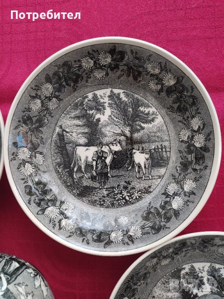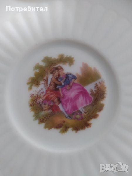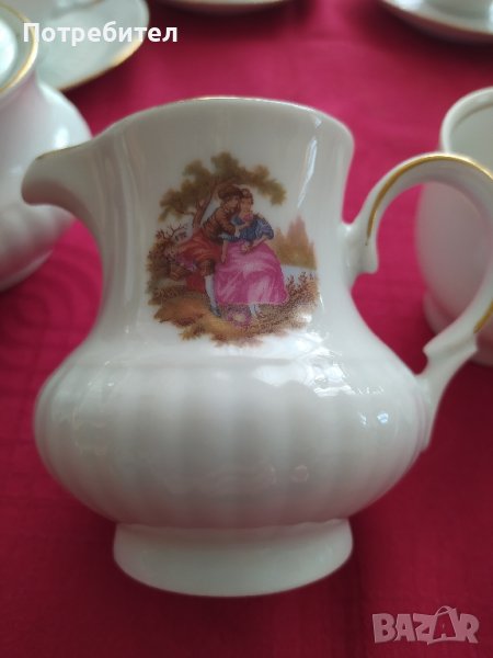 Порцеланов сервиз за чай с пасторални мотиви, запазен без забележки, цвят- сив, цена 55 евро. Сервиз за кафе с мотив от картина на Антоан Вато, фин порцелан, без забележки, цена 50 евро.И двата сервиза са немско производство с маркировки на всеки съд. Не разменям, изпращам с преглед преди плащане.
