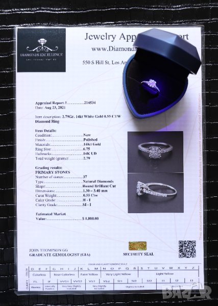 - Два броя сертификати - оценителен доклад на бижуто направен в Лос Анджелис на стойност 1800$ и цялостен лабораторен анализ за естествения произход на диамантите направен в България.