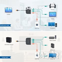 Адаптерът функционира като Ethernet комутатор 4 порта; Свържете до три допълнителни устройства към превключвателя с 4 порта; Свържете четвъртия Ethernet порт към стенна розетка RJ45, кабелен рутер или Ethernet рутер, за да споделите достъп до кабелна мрежа с до четири устройства с 4-портовия Ethernet суич; Споделяйте интернет между компютри с интернет превключвател и интернет сплитер