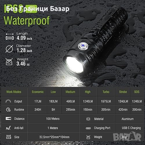 Мощна светлина: 1975 лумена, обхват до 3,28 фута.